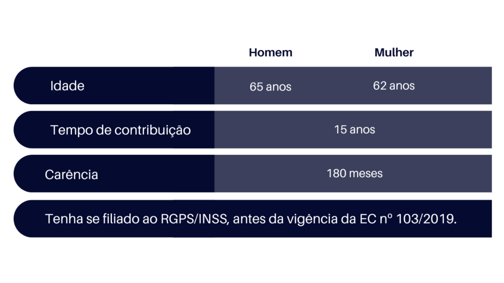 Tem direito ao recebimento de Aposentadoria por Idade Urbana, todos os segurados que tiverem contribuído por 15 (quinze) anos, e que, ao mesmo tempo, tenham atingido, no mínimo, 62 (sessenta e dois) anos para mulheres e 65 (sessenta e cinco) anos para homens, desde que tenham se filiado ao Regime Geral de Previdência Social – RGPS/INSS, antes da vigência da Emenda Constitucional nº 103/2019.
