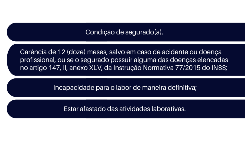 Possui o direito de receber o benefício por incapacidade permanente, aquele que demonstrar estar em condição de segurado (a), ou em seu período de graça, em tempo que está acometido por lesão ou doença que o incapacite, total e de maneira permanente para o labor, através de documentação médica.